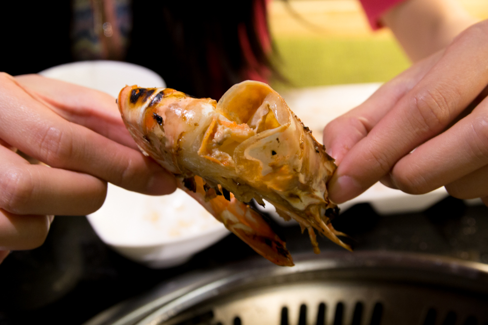 ▲草蝦先從腹部烤起,再慢慢翻面,等到頭部冒泡就可以吃囉!